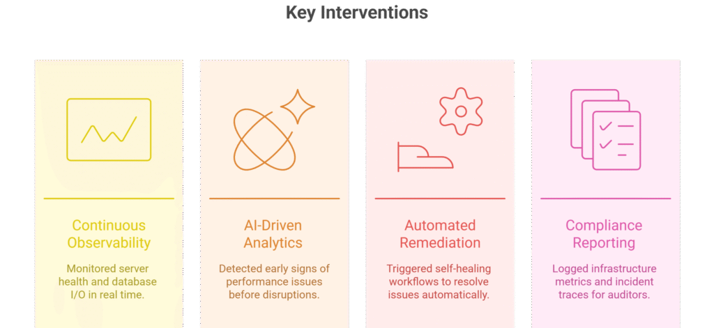 Detected early signs of CPU contention, memory leaks, and storage lag before they disrupted batch schedules.