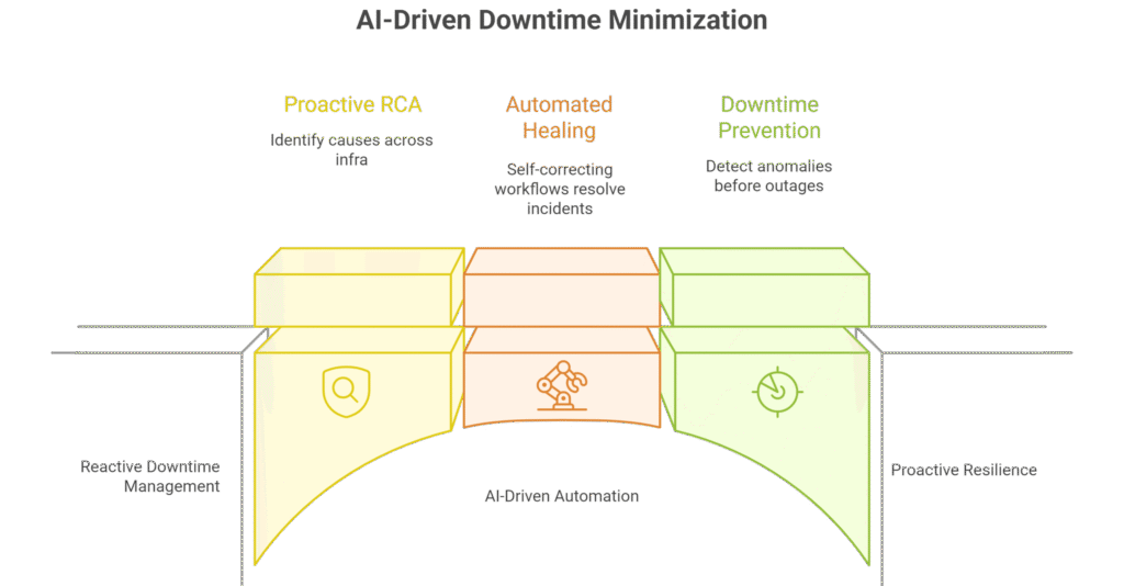 By embedding AI-driven Root Cause Analysis (RCA) and automated healing, enterprises can shift from reactive firefighting to proactive resilience. Instead of waiting for outages, systems can detect anomalies early, trigger self-healing workflows, and keep services always-on, reducing MTTR and operational costs.