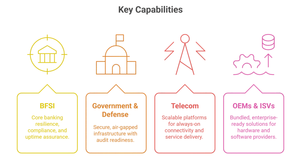 Every industry faces unique infrastructure challenges — from real-time transactions in BFSI, to mission-critical uptime in government and defense, to high-volume connectivity in telecom, and scalable solutions for OEMs. While the needs differ, the underlying demand is the same: resilient, intelligent, and compliant infrastructure.